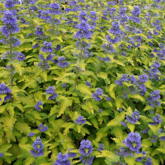 Ce petit arbuste présente un joli feuillage doré au printemps qui devient citron vert durant l'été pour se parer de nombreuses fleurs bleues à l'automne. Placé en situation ensoleillée, il donnera tout son éclat, que ce soit en massif ou en pot.