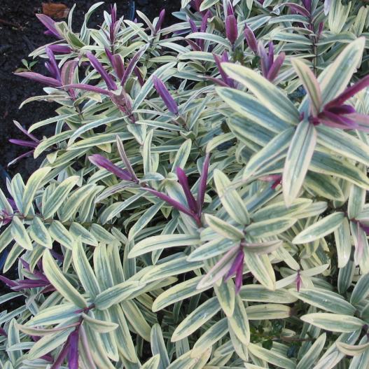 Le feuillage est blanc-gris et vert tout l'été, puis le froid colore les jeunes pousses en rose à l'automne et durant l'hiver. Au printemps, les jeunes pousses rosées se marient avec la floraison violine. La plante est compacte, lumineuse et se prête bien à la taille.