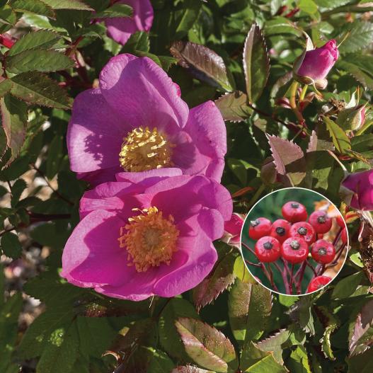 Le rosier rugueux Jam-a-Licious nous délecte de sa floraison estivale généreuse et parfumée, d’un magenta lumineux, suivie d’une profusion de gros cynorhodons rouge-orangé prolongeant son attrait jusqu’en hiver. Décoratifs et savoureux, ces fruits sont parfaits pour réaliser de délicieuses confitures maison. Les tiges rougeâtres, portant moins d'épines que les autres rosiers rugueux, apportent une touche ornementale supplémentaire durant l'hiver. Facile à vivre, il s’adapte à tous les sols et tolère bien la taille. Idéal en massifs, haies libres ou en pot, c’est un rosier aussi robuste que savoureux.