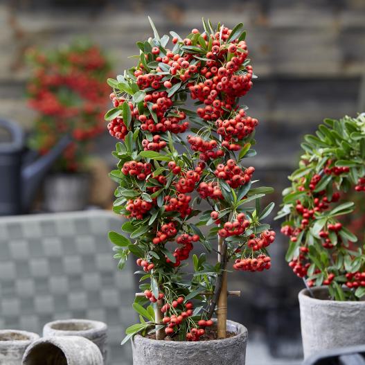 Red Star se pare de fleurs blanches au printemps sur le bois de deux ans, et en été les fruits apparaissent vert puis rouge jusqu'à Noël. Cette variété extrêmement mellifère attire une grande diversité d'insectes au printemps. Elle peut se cultiver en pot ou en bac, se palisser pour couvrir des murs ou se placer en haie.