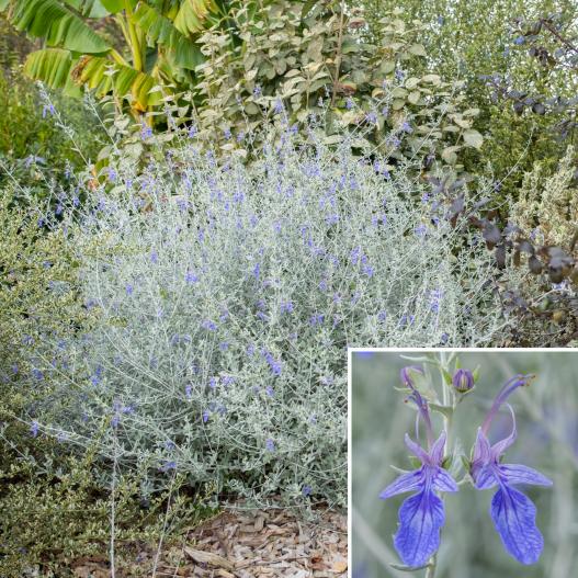Couleur feuillage : gris Couleur de Fleur : bleu Période de floraison : septembre à avril Exposition : soleil Hauteur/Largeur : 1,20 / : 1,20 Rusticité : -07 / -10°C Sol : drainant à sec Parfum : légèrement parfumée (*/***)