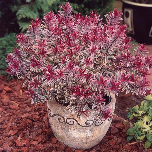 Ce petit buisson persistant séduit par ses couleurs rose vif et crème ; l'hiver plus rouge avec des reflets roses et l'été rose avec des reflets crèmes. La floraison violet clair printanière comblera l'enchantement. Idéal en pot, il convient également en bordure de massif. Plante facile.