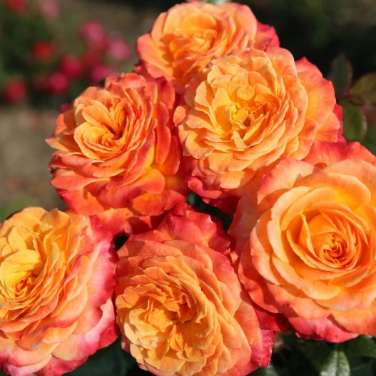 La forme de la fleur est assez unique, composée d'un très grand nombre de pétales n'ayant pas tous la même tonalité puisque l'on passe du rose à l'orange avec quelques notes de jaune et de blanc dans une parfaite harmonie. Excellente résistance aux maladies.