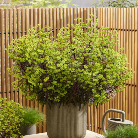Cette Euphorbe à la belle robe pourpre (Merlot) est un petit buisson compact qui se pare de fleurs jaune d'or au printemps. C'est une plante facile qui ne demande pas d'entretien particulier. Elle aime le soleil et s'accomode de peu d'eau. Elle se plaît au soleil en pot comme en massif.