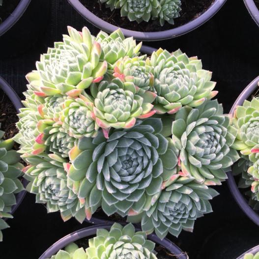 Cette joubarbe est recouverte de petits poils lui donnant l'aspect du velours. Elle se compose de rosettes bleu-vert aux pointes roses. Une belle variété à associer aux autres joubarbes de la série CHICK CHARMS®.