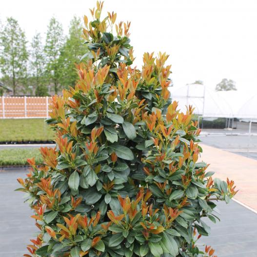 Le Prunus laurocerasus Bonaparte a des pousses rouge-brun qui apportent de la couleur au feuillage des lauriers cerise. Il a un port dense et érigé et maintient une belle forme en grandissant. Ses fleurs sont blanc et rose. Il est idéal pour les haies ou en solitaire.