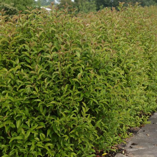 Ses jeunes pousses sont orangées puis deviennent rougeâtre en bordure sur des tiges rouges. Elle passent ensuite au vert franc et laissent apparaître des fleurs en grappes blanches très odorantes en été. Son port naturel globuleux facilite son emploi en haie comme en pot en solitaire.