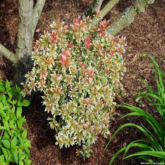 Cette andromède du Japon compacte et colorée est une superbe nouveauté pour les jardins. Son feuillage élégant est marginé d'une bordure blanc crème et ses jeunes pousses sont d'un beau rose saumon toute l'année. La floraison intervient au printemps, avec des grappes de petites clochettes blanches. Très rustique, elle se plaît en plein soleil et à mi-ombre.