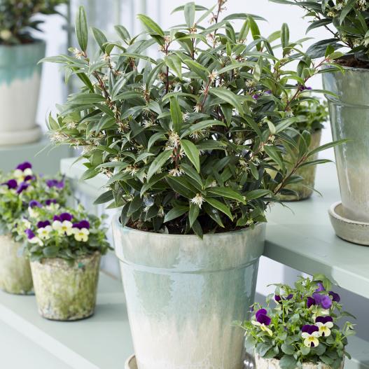 Avec son port compact, sa floraison parfumée, le buis parfumé Purplue Gem est une plante à garder près de soi l'hiver ! En effet, ses nombreuses petites fleurs blanches très parfumées ressortent des branches rouges et du feuillage vert sombre. Son port compact lui confère une très bonne tenue en pot, au soleil ou à la mi-ombre. Placez-le près des lieux de passage pour profiter de son parfum l'hiver venu.