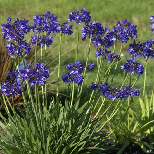 Belle agapanthe à la floraison hâtive et aux fleurs bleu foncé. La base de la tige est noire. Son utilisation est recommandée pour les bordures, les potées et les massifs avec les rosiers.