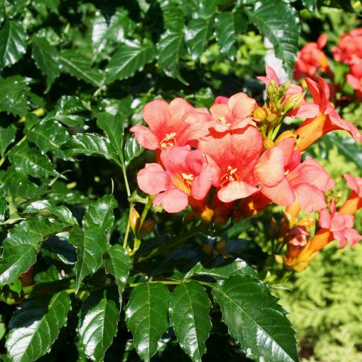 Une vraie grimpante qui s'accroche seule sur son support et porte en été une profusion de trompettes éclatantes. Les trompettes orangées sont mises en valeur sur un feuillage vert foncé brillant. Ce superbe feuillage sert de fond idéal pour présenter un massif coloré. La floraison généreuse tout l'été s'associe avec des plantes aux tons chauds.