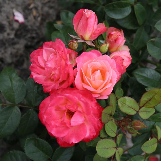 Le rosier Enjoy est un rossier à massif bien fleuri dont les roses semi-doubles aux couleurs inhabituelles s'épanouissant de l'orange abricot au rouge cerise. L'obtention du label ADR en 2019 prouve sa grande résistance aux maladies.
