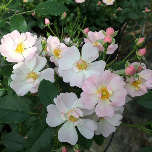 Variété aux fleurs d'un rose délicat, il illumine l'été mais surtout l'automne de ses fleurs simples blanches et roses au cœur jaune. Un rosier couvre-sol très sain et résistant.