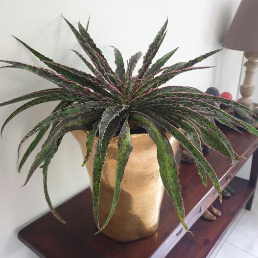 Une rosette basse et étalée avec de longues feuilles vertes contenant des taches de chocolat et des bords ondulés. Les marges blanches et crémeuses étroites présentent des taches rouge cerise.