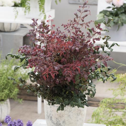 Le Nandina Curly Obsessed porte les mêmes couleurs que le Nandina Obsessed, à la différence que ses feuilles sont recourbées. Les nouvelles pousses pourpres ressortent sur le feuillage vert sombre. De port compact, il demande peu d'entretien et est parfait en pot ou en massif dans le jardin.