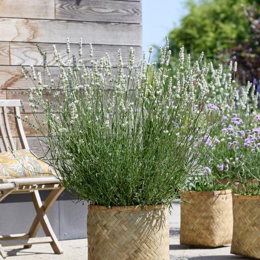 Proche du lavandin, cette lavande aux fleurs blanches possède en été de grands épis bien fournis en fleurs. Les fleurs quant à elles sont plus grandes et s'ouvrent plus que les lavandes classiques, donnant aux épis un effet de masse remarquable. Elle est idéale pour les massifs, les haies basses, les pots et les bacs. Elle convient également parfaitement pour une plantation dans un massif de rosiers, pour mélanger les couleurs et les parfums et éloigner les insectes.