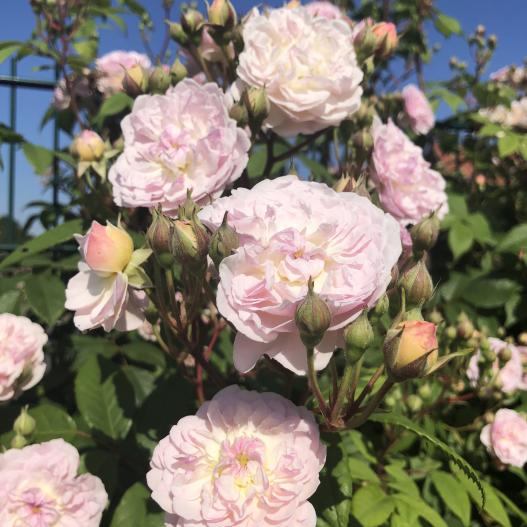 Rosier grimpant qui porte des bouquets de petites roses très doubles couleur rose tendre. Il est parfumé et se comporte très bien en pot.