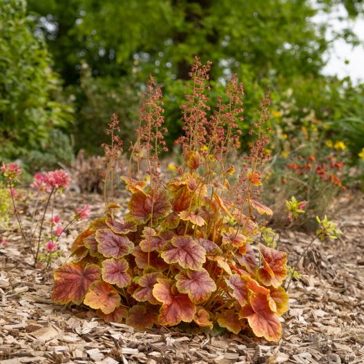L'heuchère Eternal Flame porte bien son nom avec un feuillage en constante évolution, tel un feu éternel. Ses feuilles rouge-pourpre sont bordées de jaune citron au printemps puis de vert citron après la floraison. Cette plante attrayante et dense produit des fleurs rose vif, offrant une touche de couleur flamboyante au jardin. Plantez-la en sol bien drainé et frais, à mi-ombre, pour un spectacle lumineux toute l'année.