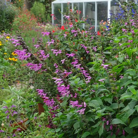 En fleur tout l'été, cette sauge offre une floraison rose généreuse. Les tiges florales sont nombreuses et composées de fleurons roses à la base vert et pourpre presque noir. Elle tolère les sols secs, que ce soit en massif ou en pot.