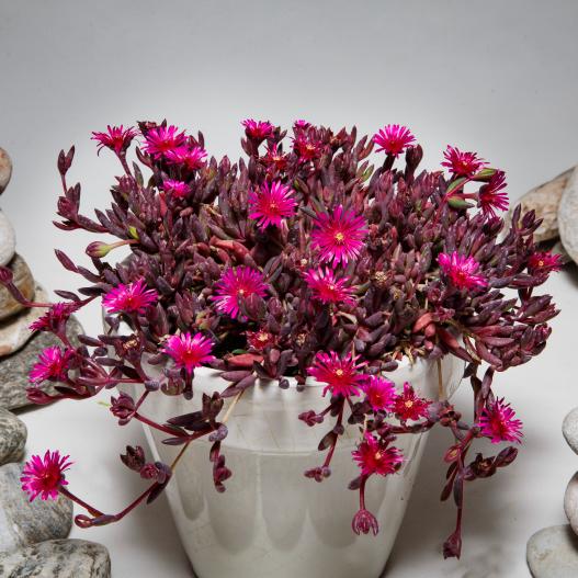 Le délosperma DESERT DANCERS Purple se distingue par ses nouvelles pousses rose vibrant qui évoluent vers un pourpre élégant en été. Son feuillage, esthétique même sans les fleurs, offre un attrait tout au long de l’année. Ses fleurs abondantes égayent le jardin tout l’été, offrant un impact visuel constant. Avec son port en boule homogène, ce délosperma est idéal pour les paniers suspendus, les bordures et les rocailles. Nécessitant peu d’entretien, il préfère un sol bien drainé et une position ensoleillée.