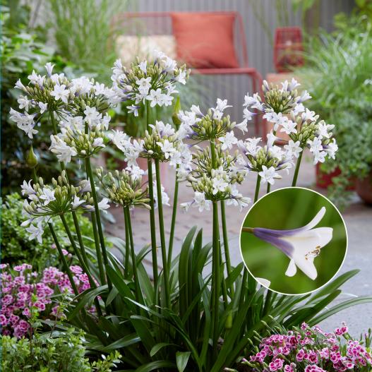 Faites étinceler votre jardin avec l'agapanthe Sparkle, une source d'attention pour votre jardin. Ses fleurs bicolores à l'extérieur et immaculées à l'intérieur, ressemblent à des étincelles qui dansent sous le soleil. Cette variété d'agapanthe est également incroyablement florifère et remontante, vous offrant un spectacle floral durable de juin à août. Compacte, elle s'intègre parfaitement dans les petits espaces. Ajoutez des étincelles florales qui illuminent votre jardin avec l'agapanthe Sparkle.