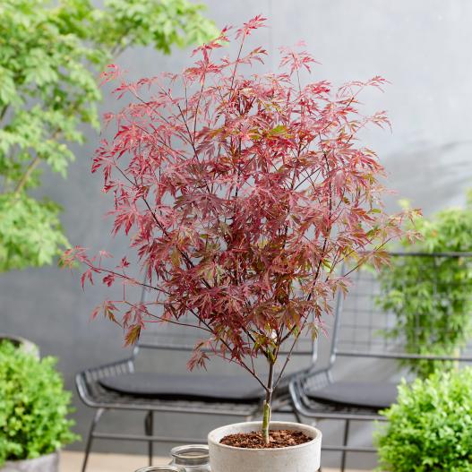 L'érable du Japon Royal Garnet vous émerveillera à chaque saison. Dès le printemps, ses nouvelles feuilles se parent d'un rouge grenat resplendissant nuancé par quelques touches de vert. À l'automne, une métamorphose opère et l'érable se transforme en une flamme ardente, avec même des touches bleuâtres surprenantes. Sa croissance débute avec une silhouette verticale, mais au fil des années, il s'étend et prend de l'ampleur, avec une ramification harmonieuse. Avec son magnifique feuillage aux couleurs changeantes, Royal Garnet est un érable qui fera rayonner sa splendeur sur votre jardin. Protégez-le des courants d'air froid.