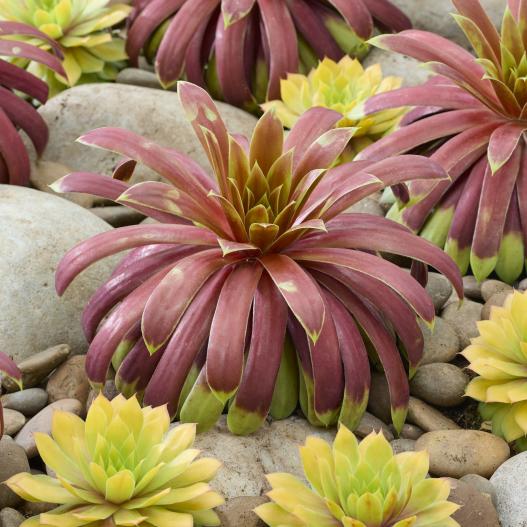 Gold Mine, une merveille de la série CHICK CHARMS® GIANTS, évoque une mine d'or avec son feuillage éclatant, passant du jaune vif au rouge intense en période froide. Ses rosettes géantes captivent par leur éblouissante métamorphose de couleurs. Incroyablement résistante au froid, cette joubarbe se plaît dans les sols bien drainés et sous un soleil éclatant. Elle prospère dans les rocailles et les bordures, nécessitant peu d'arrosage une fois établie. Associez-la aux autres variétés de joubarbes CHICK CHARMS® et CHICK CHARMS® GIANTS pour des compositions colorées et résistantes.