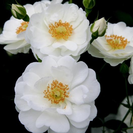 Raffinées, ses petites roses d'un blanc pur au bouquet d'étamines jaune d'or s'illuminent sur son feuillage vert franc et très sain jusqu'aux gelées. Son port buissonnant et couvrant fond de lui un excellent couvre-sol de 50 cms capable de garnir les talus, bordures et bacs. Il a obtenu l'ADR, qui confirme sa très grande résistance aux maladies ainsi que sa floribondité.