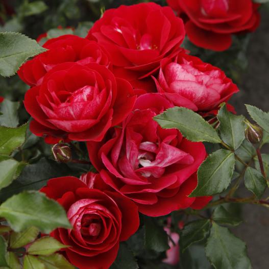 Des fleurs rouges dégradées de blanc font de ce rosier une variété aussi belle qu'originale. Il a obtenu l'ADR, qui confirme sa très grande résistance aux maladies ainsi que sa floribondité.